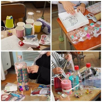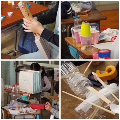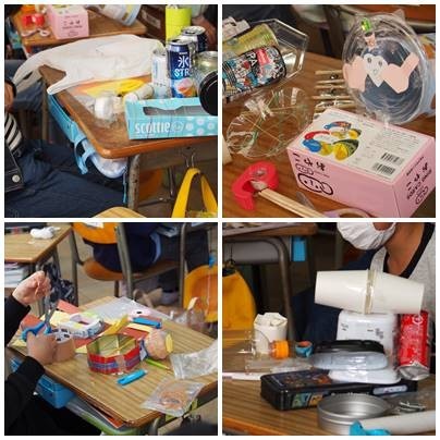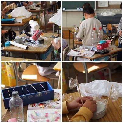 2年生図工、楽器づくりをしています。ゴムや割り箸が大活躍です。