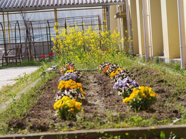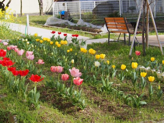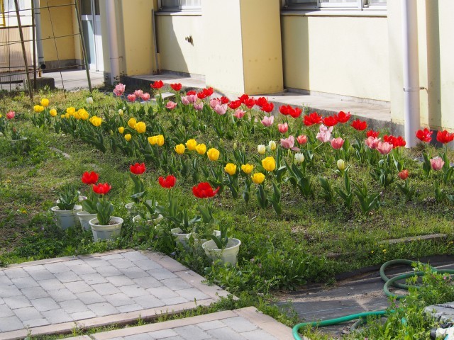 昨年度の一年生がお世話をした中庭のチューリップがきれいに咲いています。