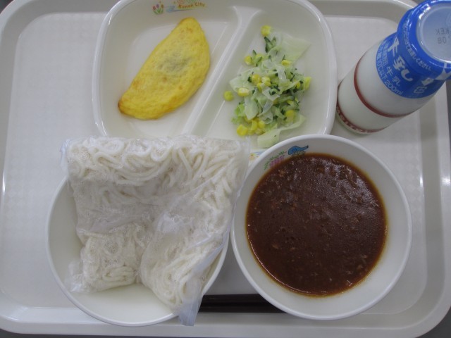 ソフトめんとミートソースは給食の人気メニューのひとつです。ソフトめんは給食用に開発されたもので、一度冷ました麺を朝もう一度蒸し上げて提供しています。