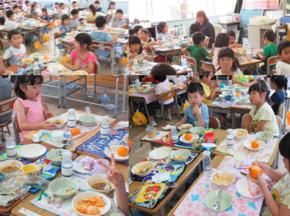 今日の給食に「冷凍みかん」が出ました。「冷たい」「気持ちいい」「おいしい」という声が教室中から聞こえてきました。ALTのジョアンナ先生も一緒に,おいしくいただきました。
