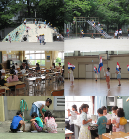 運動場で思いっきり遊ぶ子,教室で先生や友達とお話したり本を読んだりする子,クラブ活動をする子,ザリガニの水を替える子…,チャレンジタイムの様子です。