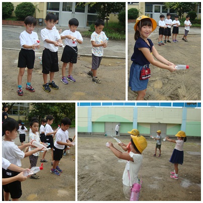 9月10日(月)の1時間目に、1年3組と4組で、生活科「水であそぼう」の学習で、家から持ってきた容器に穴をあけて、水鉄砲を作って遊びました。穴の数や穴を空ける場所を工夫しながら、楽しく遊ぶことができました。