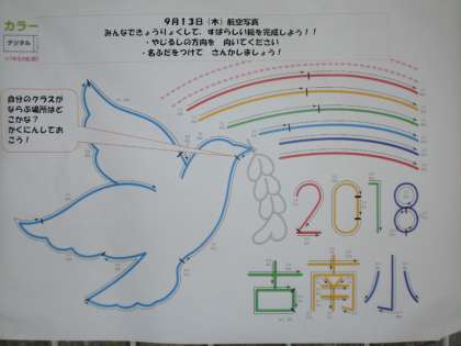 航空写真撮影への参加をご希望いただきました保護者の皆様は、午前8時35分から8時45分までに運動場岩石園前にお集まりください。自転車でお越しの際は、南門からお入りいただき、航空写真に自転車が写らないようにするため、運動場南側の藤棚の下に駐輪してください。受付は、体育館玄関前とさせていただきます。撮影時刻は9時を予定しております。