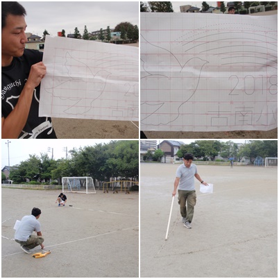 100mメジャーが1つと1mの長さの棒2本、あとは数本の杭のみで、図案が運動場に描かれていく。まさにプロの技。