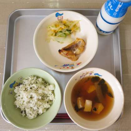 今日の給食は、わかめご飯、牛乳、かわはぎの照り焼き、切り干し大根の和え物、豆腐のすまし汁でした。