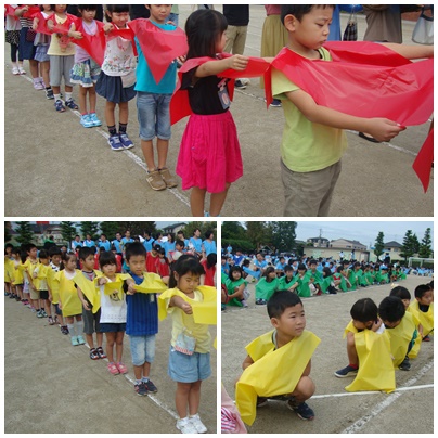 1時間目に、全校で航空写真を撮りました。1年生は、初めての取組に緊張した様子でもありましたが、飛行機が近づいてくると、「飛行機 とんでる」と嬉しそうに見上げていました。カラーのエプロンを持って立派に「前へならえ」をして、写真を撮ることができました。
