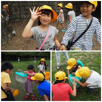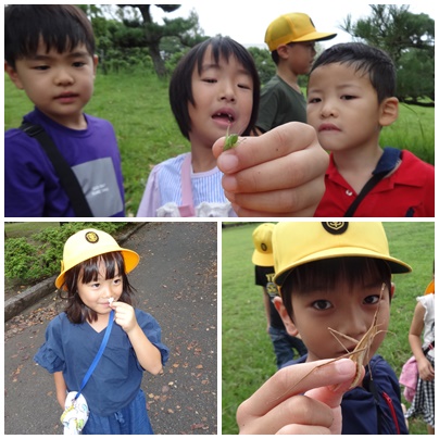 「オオバコ」で、お相撲ができることや、ねこじゃらしの葉っぱで、ピーと音が鳴ることを話すと、目をきらきらさせていました。その後、挑戦して、友だちと楽しく過ごしていました。また、白い小さな花のにおいをかいでみたり、どんぐりを拾ったり、バッタやコオロギを捕まえたりしていました。すごく生き生きとした姿に、1年担当教員の私たちも楽しくなりました。