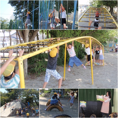 古南体力アップ作戦に運動場へ駆け出す子や、みなみかぜの読み聞かせを楽しむ子