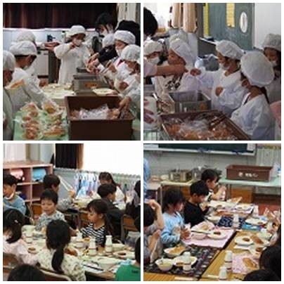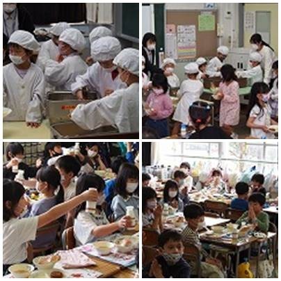 新しいクラスではじめての給食です。1年生は準備から片付けまで、先生たちの手を借りながらがんばって取り組みました。