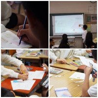 5年生、算数、三角形の面積の求め方を考えています。社会では、車の製造工程を模して...