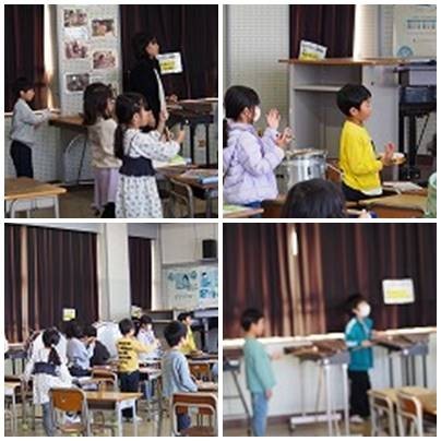 1年生音楽、いろんな楽器を演奏しました。みんなで合わせて演奏するとすてきな曲になりましたね。