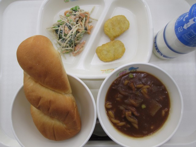 今日は食育の日の献立です。ドライカレーに入っている大豆は愛知県産です。県内でとれる大豆は主にフクユタカという品種で、たんぱく質の含有量が高く、甘みがあります。