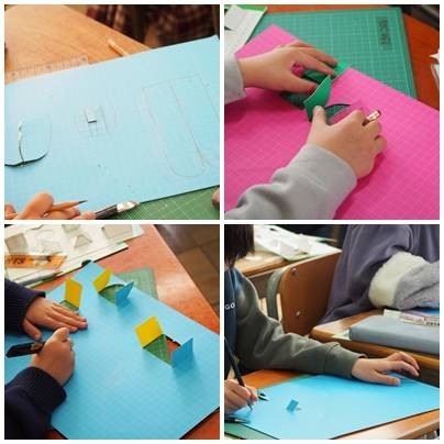 2年生図工「まどをあけたら」色画用紙を使って建物をつくります。立体になった建物を想像しながら、窓をつくっていきます。
