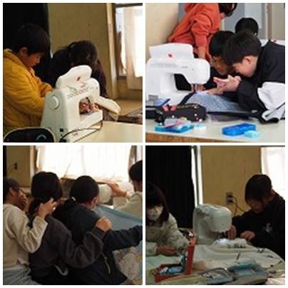 5年生家庭、ミシンを使ってエプロンをつくっています。早くも完成が楽しみですね。