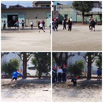 運動場、3年生がサッカーボールを使って、ベースボール型ゲームをしています。