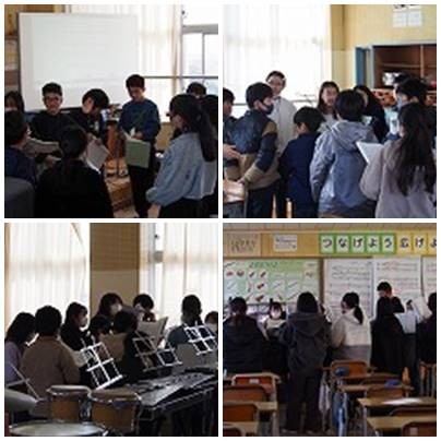5年生音楽、合唱練習中です。パートごとに話し合い、成長と課題を確かめました。