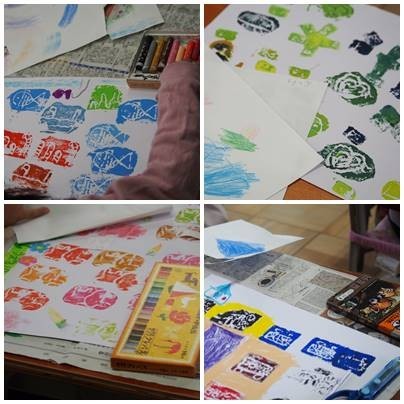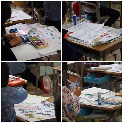 1年生図工、こすりだした模様をつかって作品をつくっていきます。