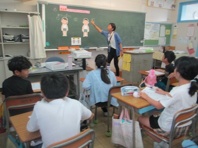 4年生の保健の授業では、養護教諭による「おとなの体になるじゅんび」という学習をしました。