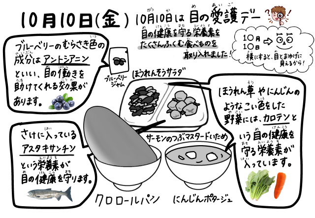 10月10日は目の愛護デーです。今日の給食に入っている、さけのアスタキサンチン、ほうれん草やにんじんのカロテン、ブルーベリーのアントシアニンは目の健康を保つのに効果的な栄養素です。