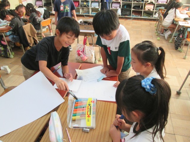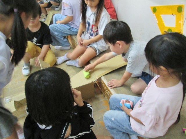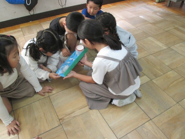 生活科の学習で作ったおもちゃを使って、1年生と一緒に遊びました。ヨットカー、めいろ、ころころころん、とことこ車、パッチンジャンプなど、どれも子どもたちの工夫がつまった力作ぞろいです。