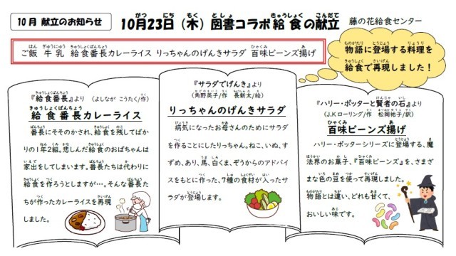 今日は図書コラボ給食です。「給食番長」、「サラダでげんき」、「ハリーポッターと賢者の石」の物語の中に登場する料理を再現しました。
