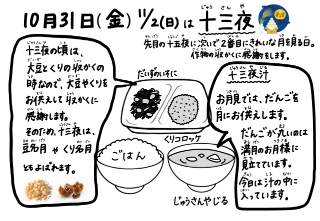 11月1日は、十三夜です。十五夜に次いで月がきれいに見える日です。十三夜は豆やくりを供えることから、豆名月やくり名月と呼ばれます。