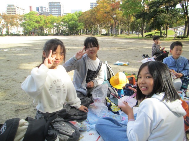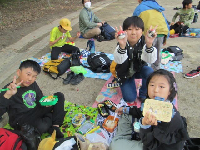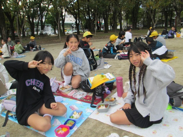 お昼ご飯は隣の白川公園で、美味しくお弁当やおやつを食べながら、班の仲を深めることができました。