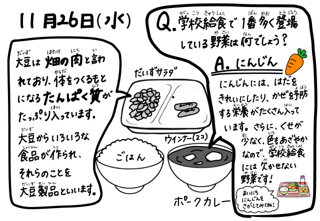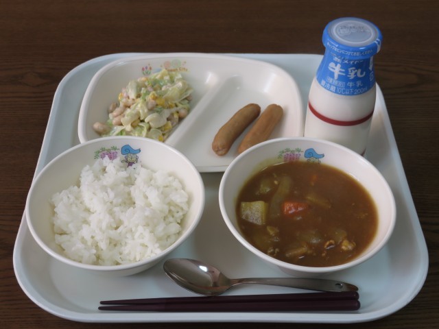 給食のカレーに一番たくさん入っている食材は、玉ねぎです。大量の玉ねぎを煮込んで作るので、うま味が増しておいしくなります。隠し味におろしりんごも入っています。