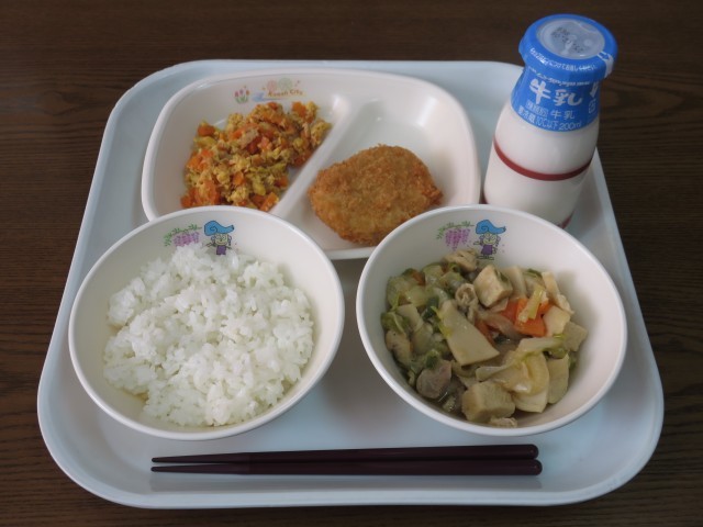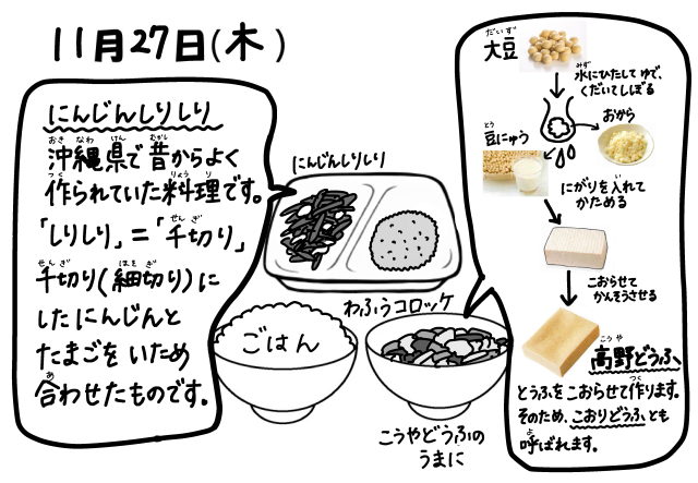 豆腐を凍らせて乾燥させたのが高野豆腐です。大豆からできる食べ物は生揚げ、おから、きなこ、みそなどたくさんあります。献立表から大豆製品を探してみましょう。