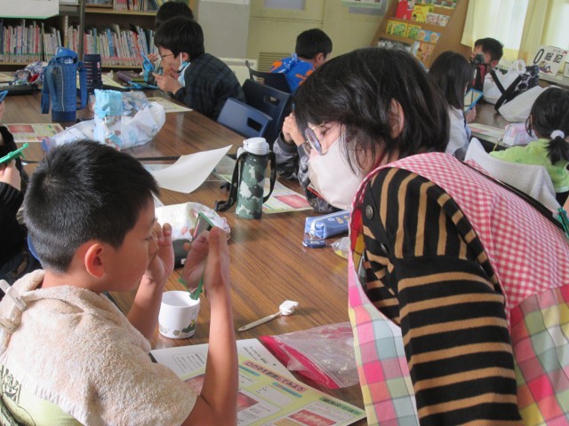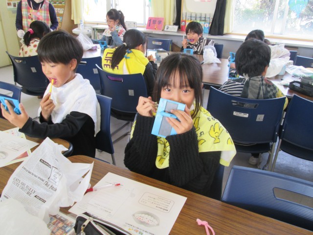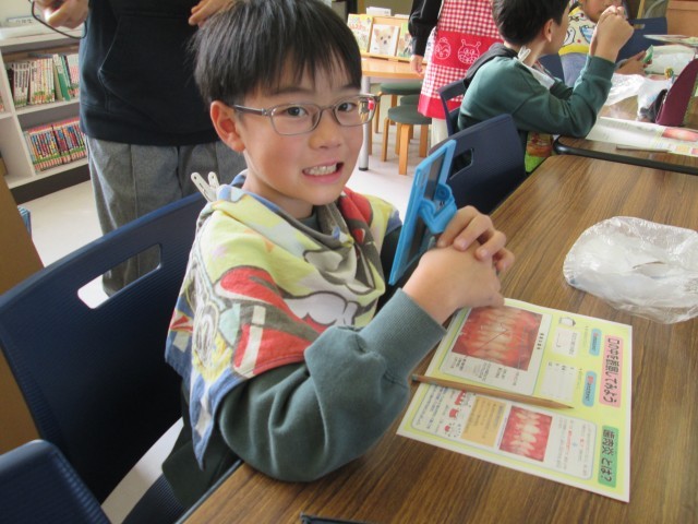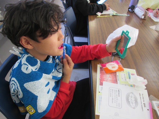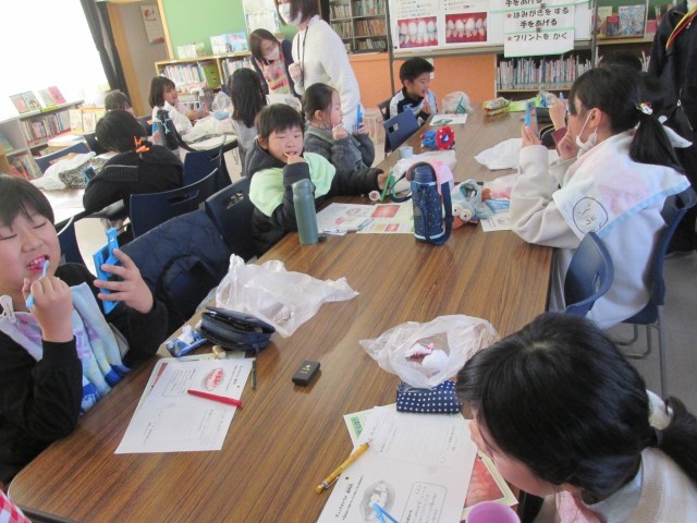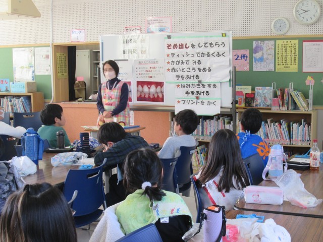 11月27日(木)に江南市保健センターより、歯科衛生士さんと保健師さんをお招きし、「チャック&トライ 歯肉炎」をテーマに、歯科指導を行っていただきました。8020運動や歯肉炎について、イラストや写真を交えてお話してくださり、歯について学ぶことができました。また、染め出しを行い、自分で歯磨きがどのくらいできているのかを確認しました。「歯ぐきの近くや歯と歯の間が汚れている」「思ったより、汚れていた」「これから、丁寧に歯磨きをしたい」などといった子どもたちの声が聞かれました。同日、ご家庭用の歯磨きカレンダーを配付いたしました。お時間のある時に、おうちの方からも歯磨きについて話題にしていただき、お声がけいただけると幸いです。小学生は、乳歯から永久歯に生え替わる時期になります。歯の健康の大切さについて学習できた貴重な時間となりました。