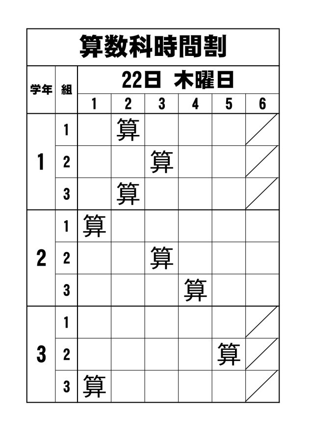 1月22日(木)の1~3年生の算数の授業予定です。