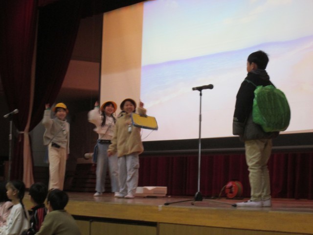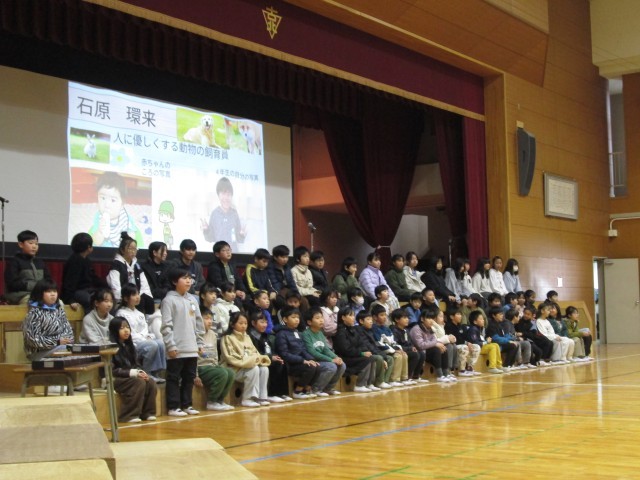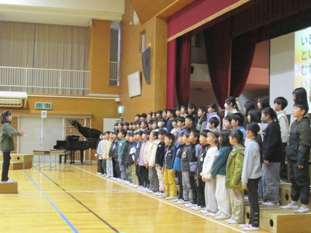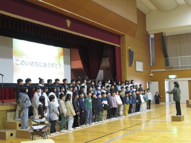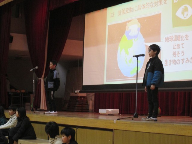 4年生は総合の学習で学んだSDGsについての劇、将来の夢宣言、合唱「いのちの歌」を披露しました。