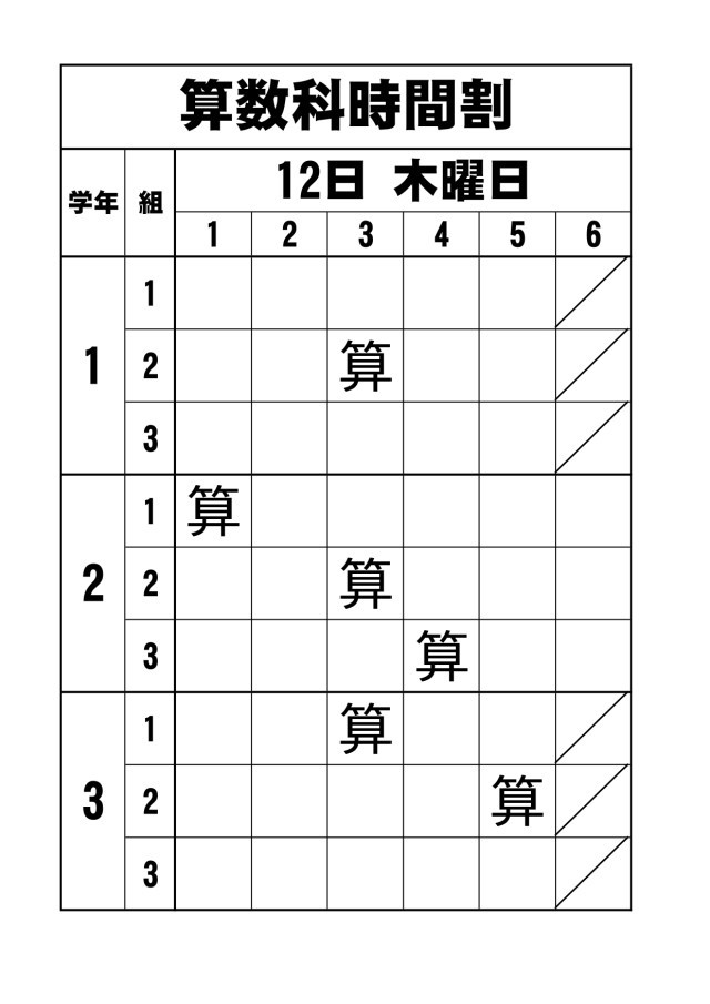 2月12日(木)の1~3年生の算数の授業予定です。