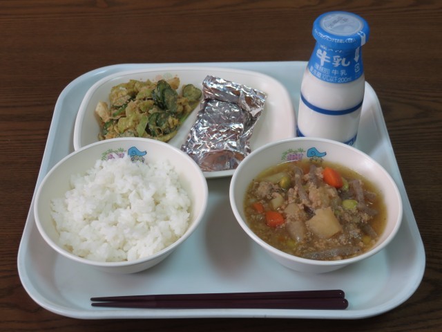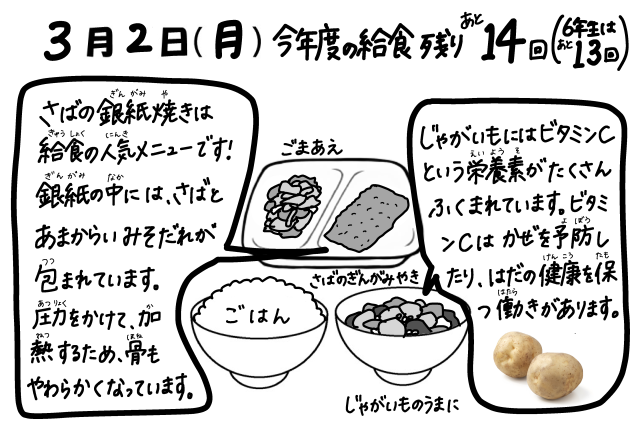 さばの銀紙焼きは愛知県の給食の定番メニューです。さばを高圧処理しているので、骨までやわらかくなっています。甘めのみそでご飯がすすむ味付けです。