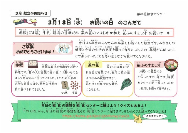 今日の給食【3月18日(水)】 卒業お祝い献立