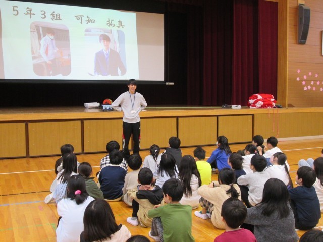 4月10日(金)5年生の学年集会が開かれました。担任の先生たちの自己紹介や学年訓「絆ぐ(つなぐ)」についてのお話、学校のきまりについて確認をしました。体育館への移動や話を聞く姿勢は、とても立派でした。早速、高学年らしい姿を見せてくれています。担任の先生たちは、バレーボールが得意で、運動が大好きです。子どもたちと体を動かしたり、遊んだりできることを楽しみにしています。学校は子どもたちの夢への懸け橋となる、大切な学び舎です。子どもたちが存分に成長できるように、尽力していく所存です。ご家庭からもあたたかいご支援いただきますよう、よろしくお願いいたします。