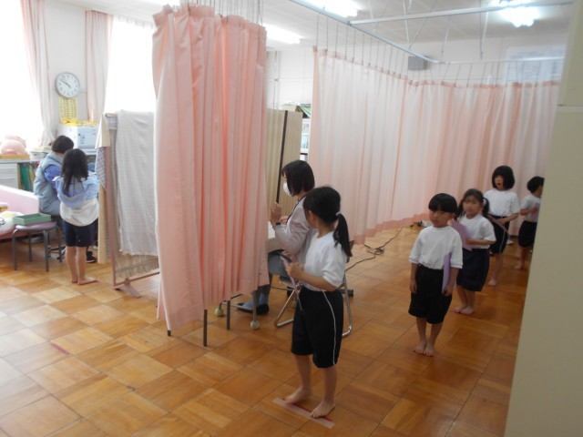 写真は、身体測定の様子です。自分の番が来るまで静かに待ったり、やり方をしっかり聞いたりとよく頑張っていました。