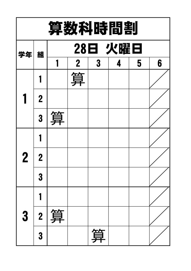 4月28日(火)の1~3年生算数の授業予定です。