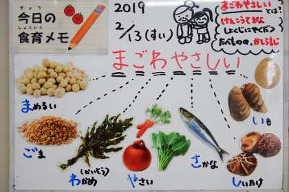 ※今日は、健康な食生活を送るポイントとなる食材の頭文字の語呂合わせ「まごわやさしい」にちなんだ献立です。それぞれ何が当てはまるか探してみてください。