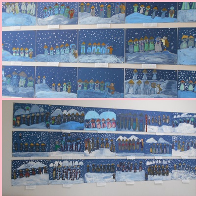 かさこじぞうの絵を掲示しました。たくさん並べると,雪景色が並んだようで,とてもきれいです。2年生が廊下を歩くときも,足がついつい止まってしまいます。絵は雪景色ですが,とても温かい雰囲気の絵が出来上がりましたね。