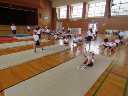 2年生の体育では、マットあそびとして、犬やしゃくとり虫など、いろいろな動きや転がり方で楽しみました。