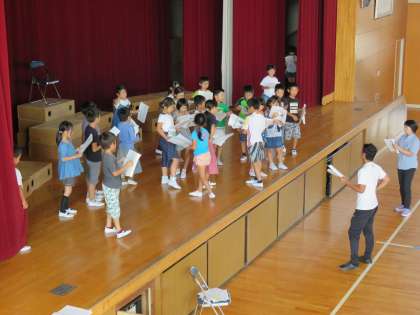 5・6時間目には、2年生全員で体育館のステージで学芸会の「80人の王様」を通して稽古してみました。役が決まったばかりですが、もうノリノリでやっている子もいて、楽しい劇になりそうです。家でも、自分のセリフや動きを練習してくれるといいと思います。