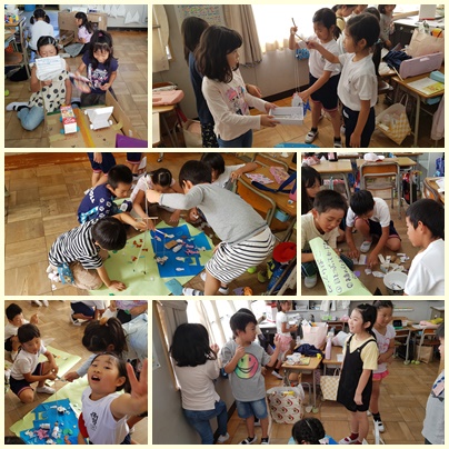 生活科の「うごくおもちゃづくり」でつくったおもちゃで学年入り交じって遊びました。それぞれのお店毎にくふうがしてあり、みんな楽しそうに交流していました。