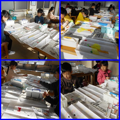 ロケット、どうぶつ、富士山など、みんな思い思いの絵を仕上げていました。
