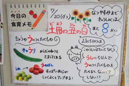※明日は土用の丑です。この時期は暑さが厳しいため、夏バテを予防するために昔から「う」の付く食べ物を食べるとよいとされ今日は、きゅうりと梅を使いました。