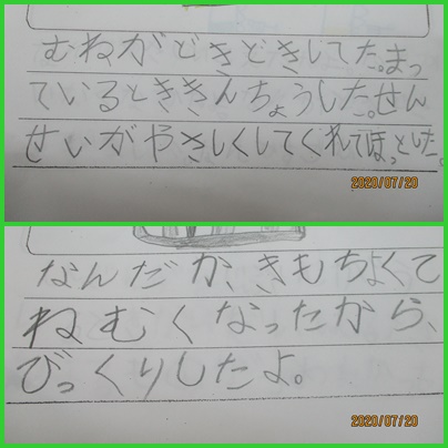 「せんせいがやさしかったです」「つめたくてくすぐったかったです」「なんかやさしいこえでした」「わたしのからだにつけるとき,すごくはやくつけたし,つめたかったです」「しんでんずをしているとき,ほいくえんのことをおもいだしました」など,感じたことを一生懸命書くことができました。