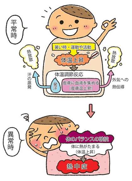 熱中症は、周りの温度に体が対応することができず、体内の水分や塩分(ナトリウムなど)のバランスが崩れ、体温の調節機能がうまく働かないなどが原因で起こります。