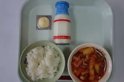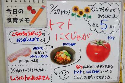 ※今日のトマト肉じゃがは、古知野中学校の応募献立です。旬の野菜であるトマトを使った肉じゃがで、食欲が落ちる夏でも、さっぱりと食べられます。