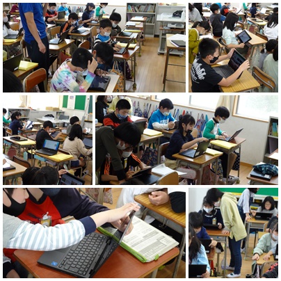 今日は、5年生の授業を訪問しました。本日、初めて一人1台の端末を触りました。インターネットを利用して調べたい内容を検索しながら端末に触れ、楽しく学びました。