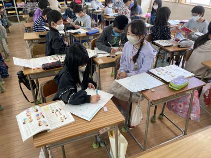 国語科「教えて、あなたのこと」の授業で、他己紹介をしました。となりの友達にインタビューをし、そこから聞き取ったことを一行にまとめ、発表をしました。発表を聞きながら、初めて聞いた友達の好きなことに驚く声もあがりました。より友達のことを知ることができましたね。